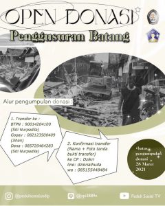 Tidak hanya berdampak pada masyarakat secara umum, namun penggusuran tersebut berdampak juga terhadap sekitar 55 anak dari SD hingga SMA yang tinggal di wilayah tersebut. Untuk itu, UKM Peduli Sosial membuka donasi untuk membantu saudara-saudara kita yang terdampak akibat penggusuran tersebut yang nantinya akan digunakan untuk membantu memenuhi kebutuhan dasar para pengungsi.