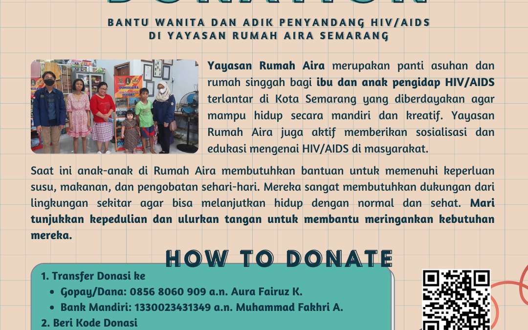 Yayasan Rumah Aira Semarang merupakan rumah singgah bagi wanita dan anak-anak pengidap HIV/AIDS yang diberdayakan agar mampu hidup secara mandiri, sehat, dan produktif. Sayangnya, masih banyak stigma negatif dalam masyarakat yang menyebabkan kelompok ini dijauhi hanya karena takut tertular. Padahal, dukungan dan semangat dari orang-orang sekitar dapat membuat mereka lebih bersemangat untuk menjalani kehidupan sehari-hari.