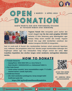 Dalam rangka Bulan Kesehatan Reproduksi, Divisi Kesehatan Peduli Sosial Undip mengadakan galang dana untuk membantu adik-adik pengidap HIV/AIDS untuk memenuhi kebutuhan harian mereka seperti susu, makanan, dan obat-obatan. Mari tebarkan kebaikan dan kepedulian dengan berdonasi kepada mereka yang membutuhkan.