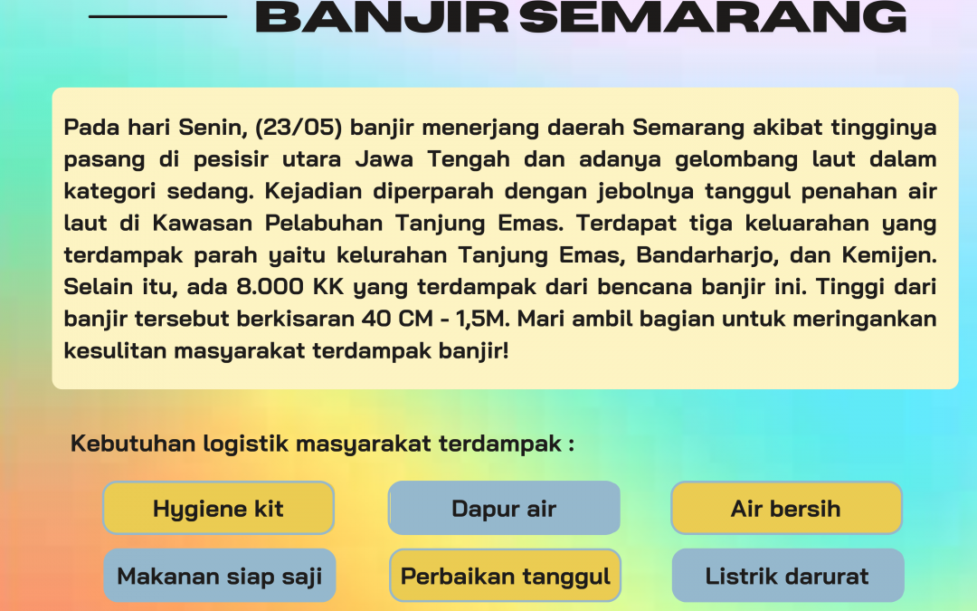 Terdapat kurang lebih 8000 KK dan 3 kelurahan yang terdampak parah yaitu kelurahan Tanjung Emas, Bandarharjo, dan Kemijen. Saat ini diperlukan beberapa kebutuhan seperti: